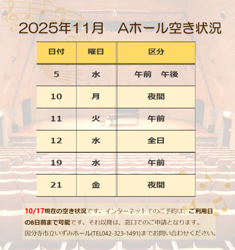 2025年10月17日 Aホール 2025年11月分 空き状況のご案内