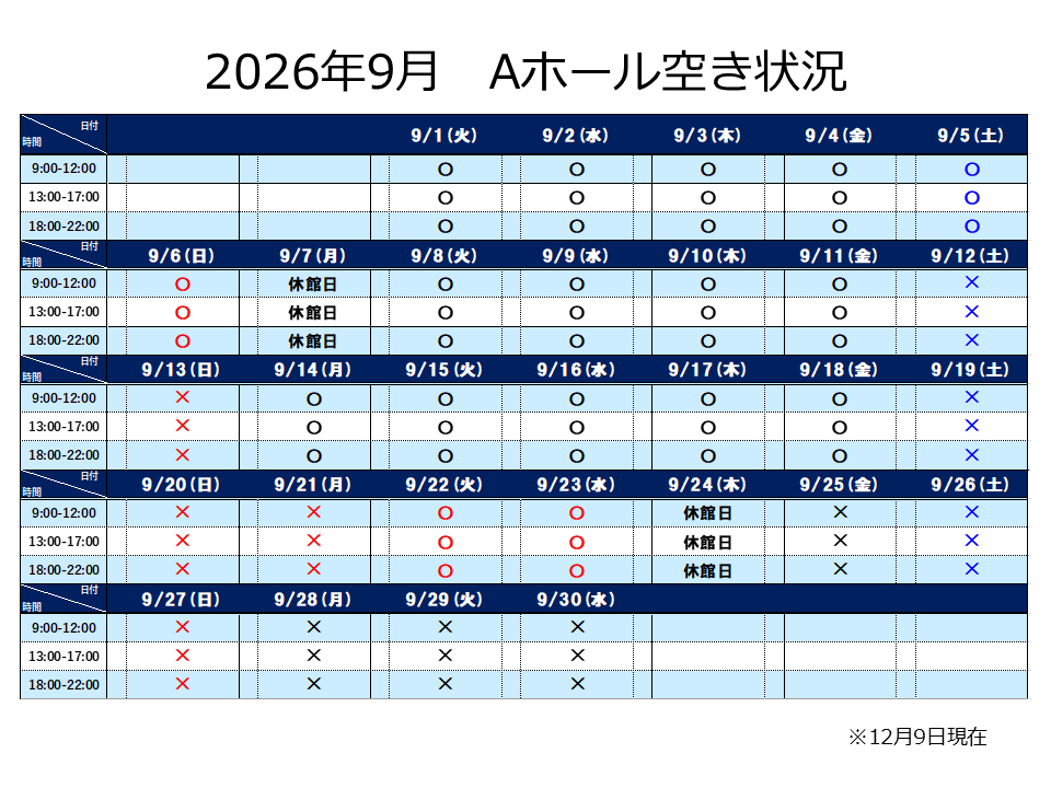 2025年12月9日 Aホール 2026年9月分 抽選申込のご案内