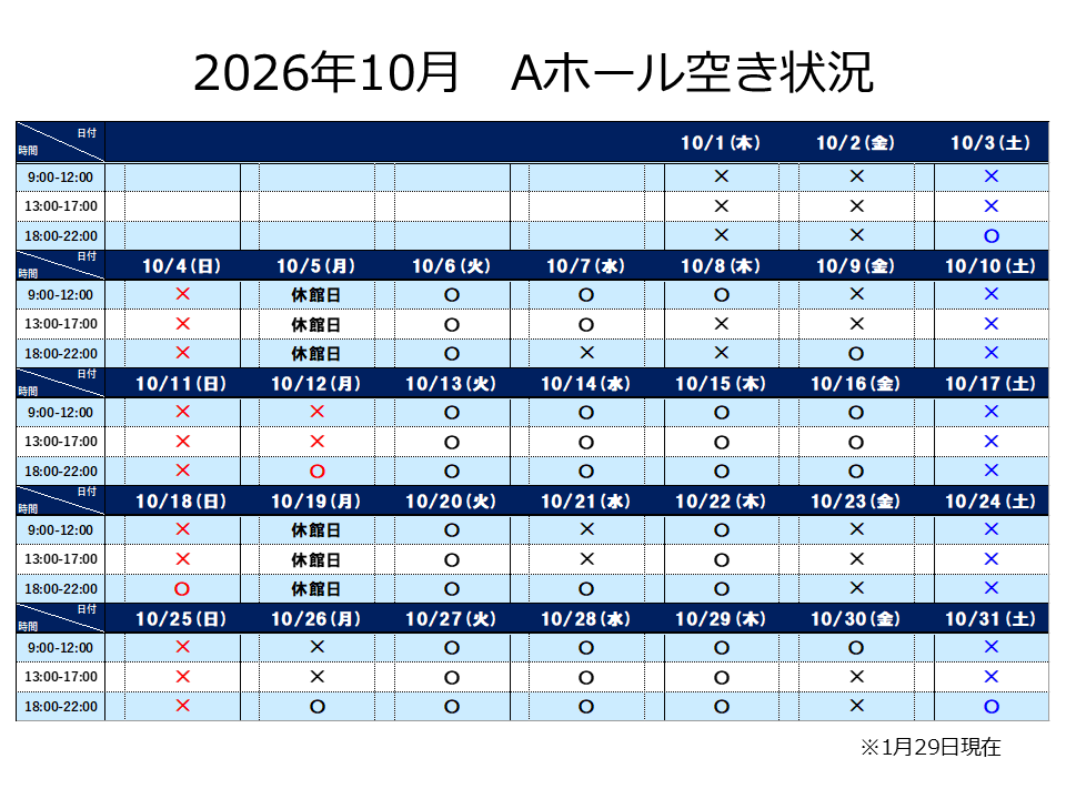 2026年1月29日 Aホール 2026年10月分 先着予約のご案内