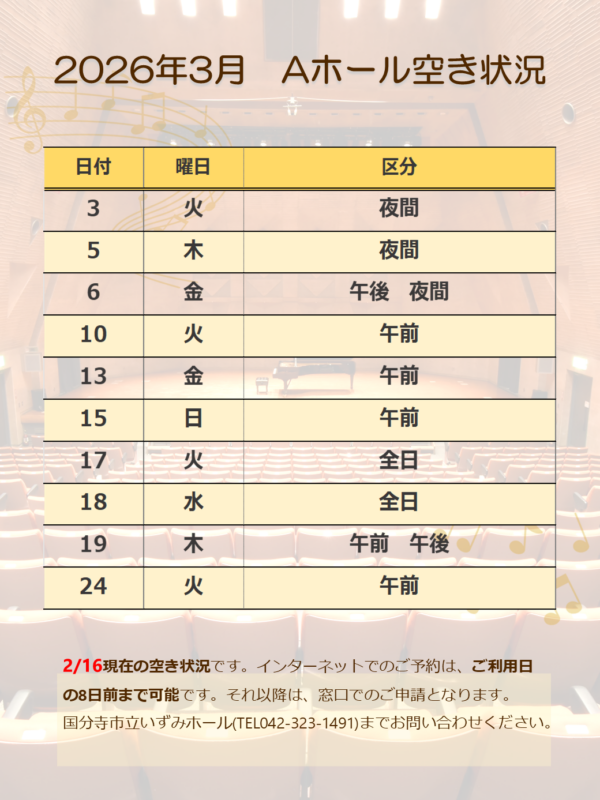 Aホール 2026年3月分の空き状況につきまして、下記の通りご案内いたします。