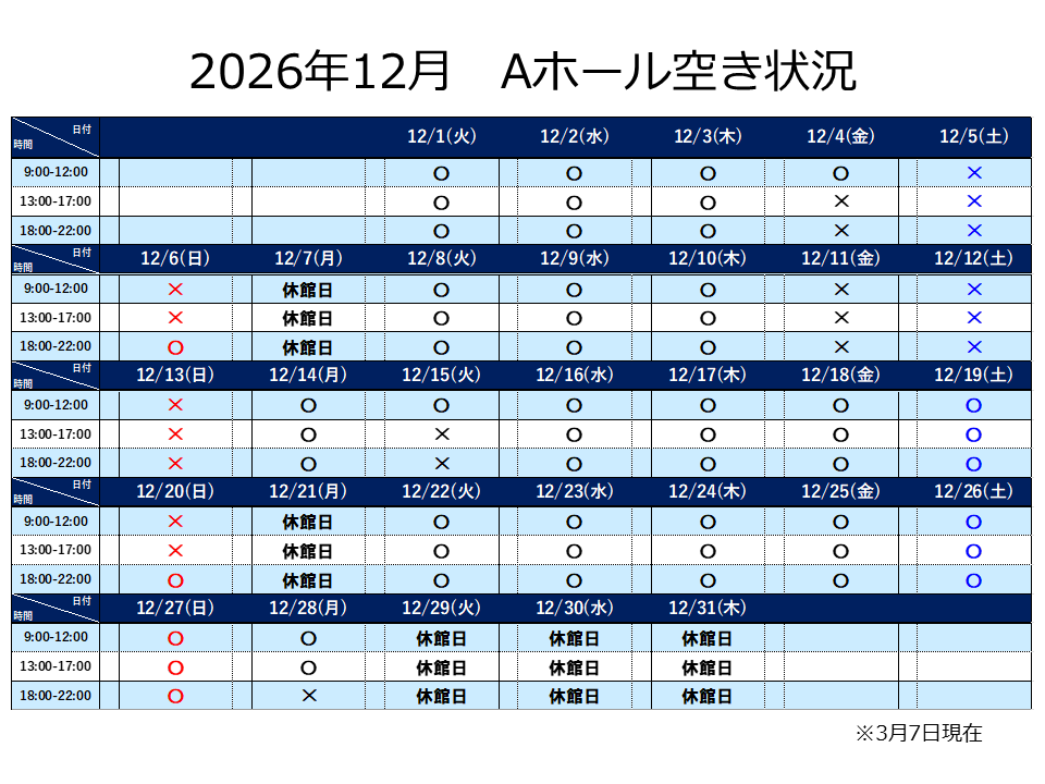 Aホール 2026年12月分の抽選申込につきまして、下記の通りご案内いたします。