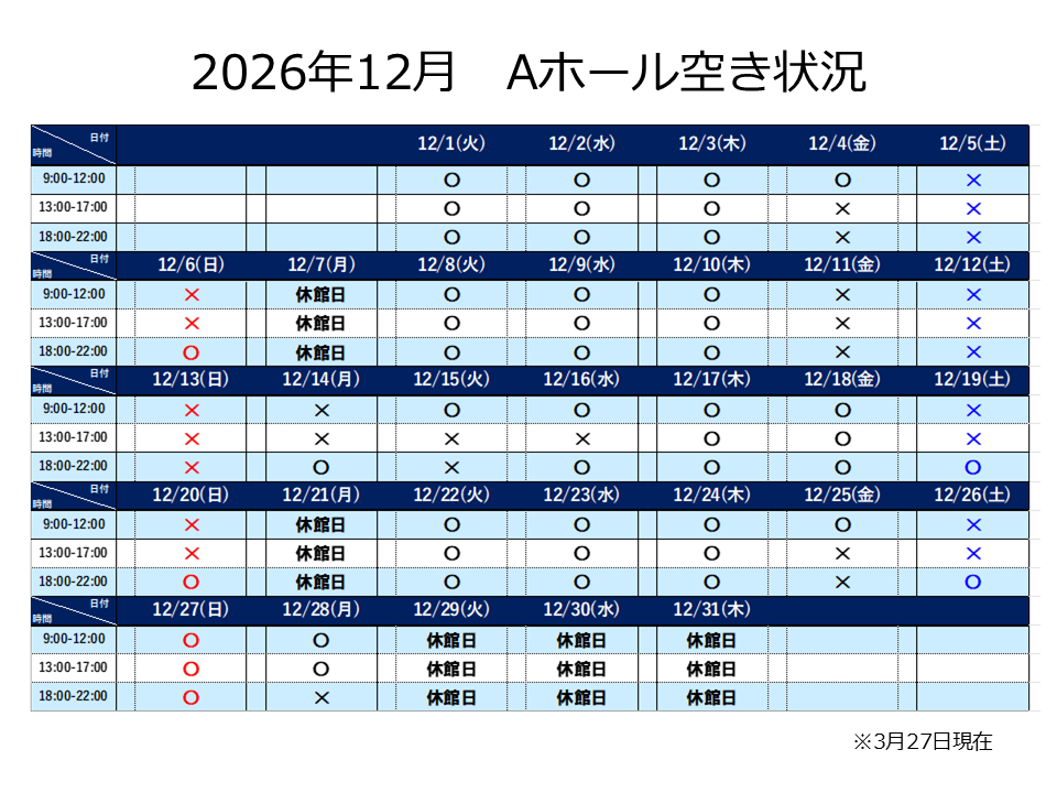 Aホール 2026年12月分の先着予約につきまして、下記の通りご案内いたします。